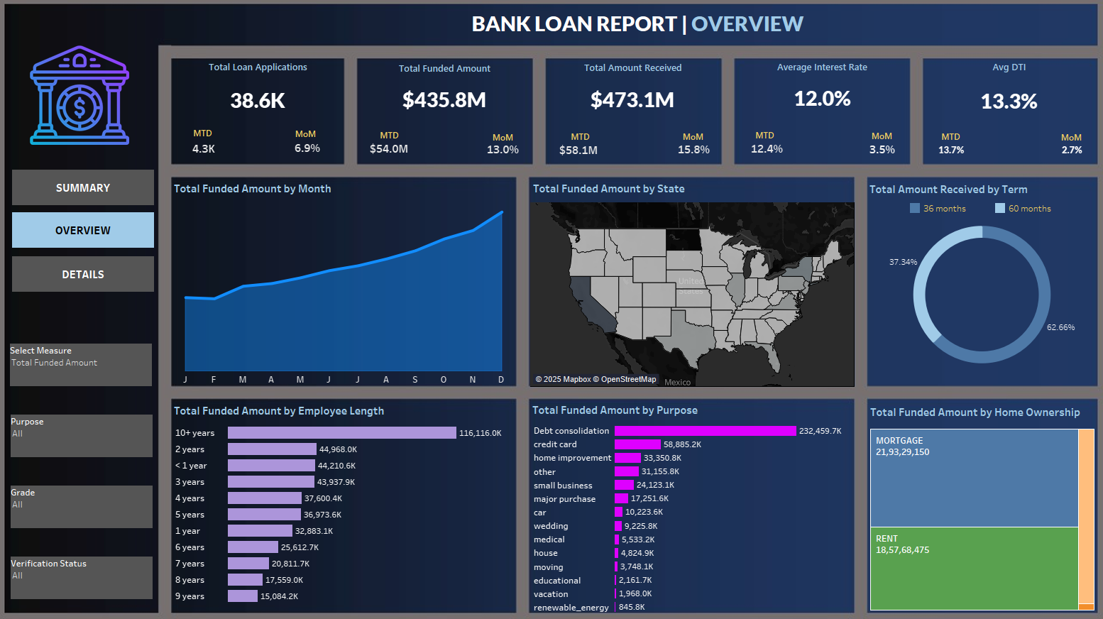 Bank Loan Analysis using Tableau and SQL Developed an end-to-end data visualization and analysis project in the finance domain using Tableau and SQL. Analyzed bank loan datasets to derive insights on loan distribution, repayment trends, default rates, and customer segmentation. Designed interactive dashboards and reports to visualize key metrics, enabling data-driven decision-making. Utilized SQL for data querying and preparation, ensuring clean and structured data for analysis. Gained hands-on experience in finance analytics, data visualization, and business intelligence tools.